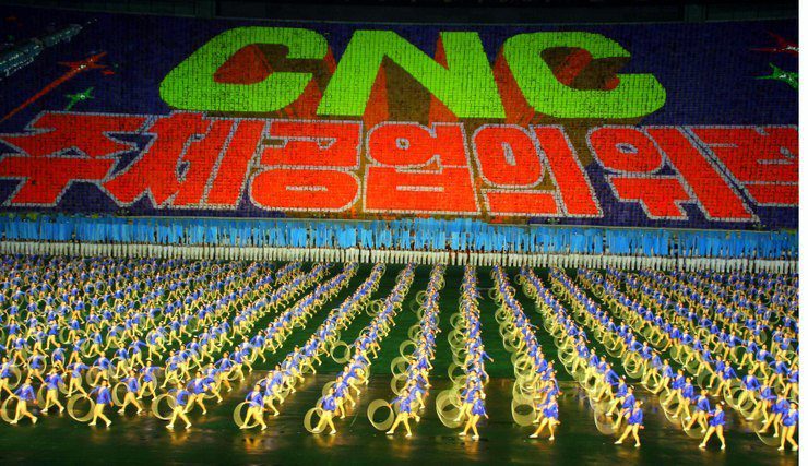 The highly politicized, patriotic Mass Games in Pyongyang, North Korea is a synchronized socialist-realist spectacular, featuring over 100,000 participants in gymnastics, dance, acrobatics and song.